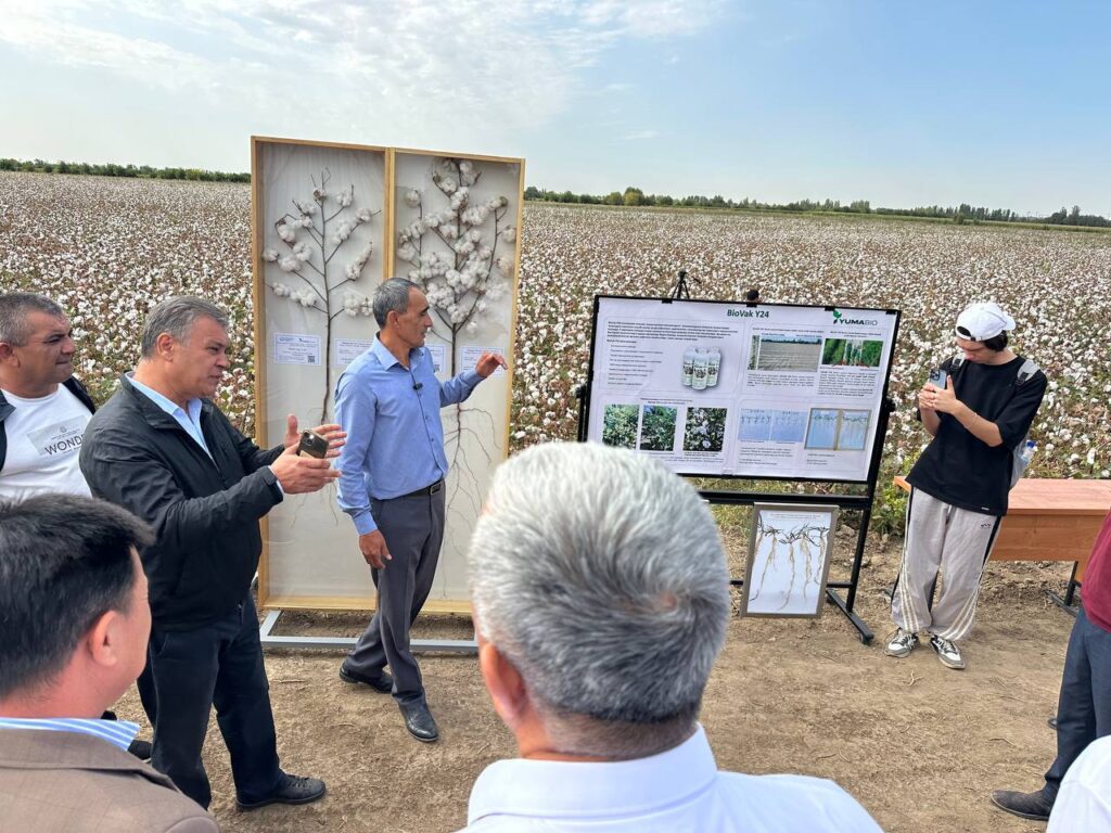 Xususan, “Mirzayev Islom” fermer xo‘jaligining 33 gektarlik maydonida g‘ozaning “Sulton” navi “Biovak Y24” biosimulyatori bilan ishlov berilganida ijobiy natija kuzatildi. Tajriba davomida preparat qo‘llanilmagan nazorat maydoni ham namoyish qilinib, undagi 12 qator g‘ozaning rivoji va hosildorligi past bo‘lgani ko‘rsatildi.